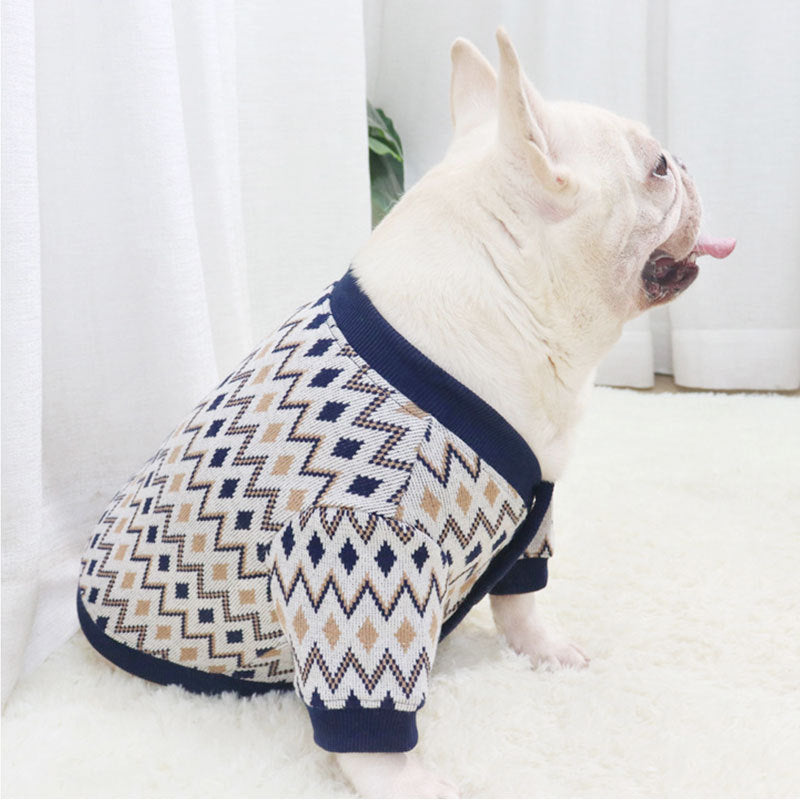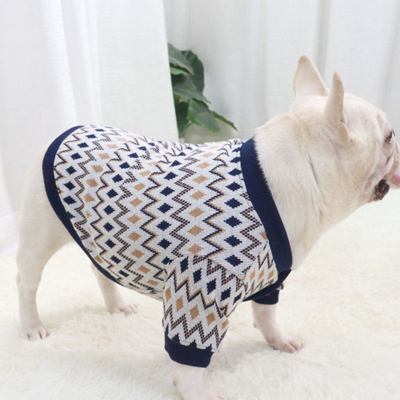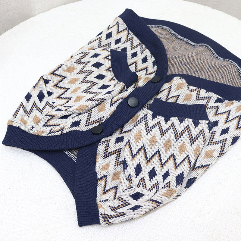 Wrap your pet in cozy charm with this geometric knit cardigan — perfect for crisp walks or stylish lounge days. Designed for a snug, easy slip-on fit with stretchy comfort that moves with your pet.
